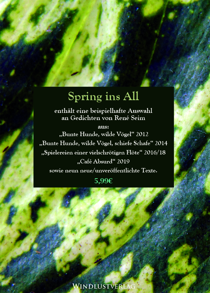 René Seim "Spielereien einer vielschrötigen Flöte", 50 Gedichte/Texte +24 Farbfotos im A5 Buchformat (Hardcover, Glanzpapier - 68 Seiten, 14,90€) Im Buchhandel (ISBN: 978-3-00-059380-2) oder über www.headlust.de erhältlich.