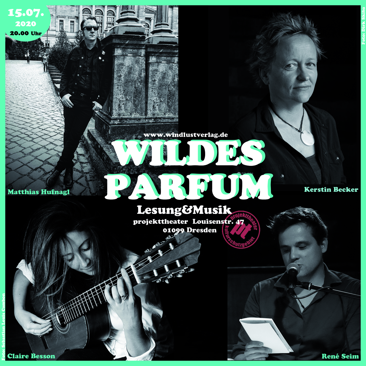 Am 15.07.2020 werden in Dresden Texte aus dem neuen Buch im Rahmen von "Wildes Parfüm - Lesung & Musik" im projekttheater Dresden vom Berliner Autor Matthias Hufnagl vorgestellt. An diesem sind Kerstin Becker (Lyrik), Claire Besson (Girarre) & René Seim (Lyrik, Prosa) mit ihm auf der Bühne agil. Info: https://www.facebook.com/events/185684952774762/